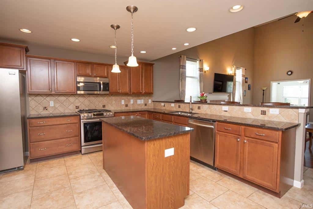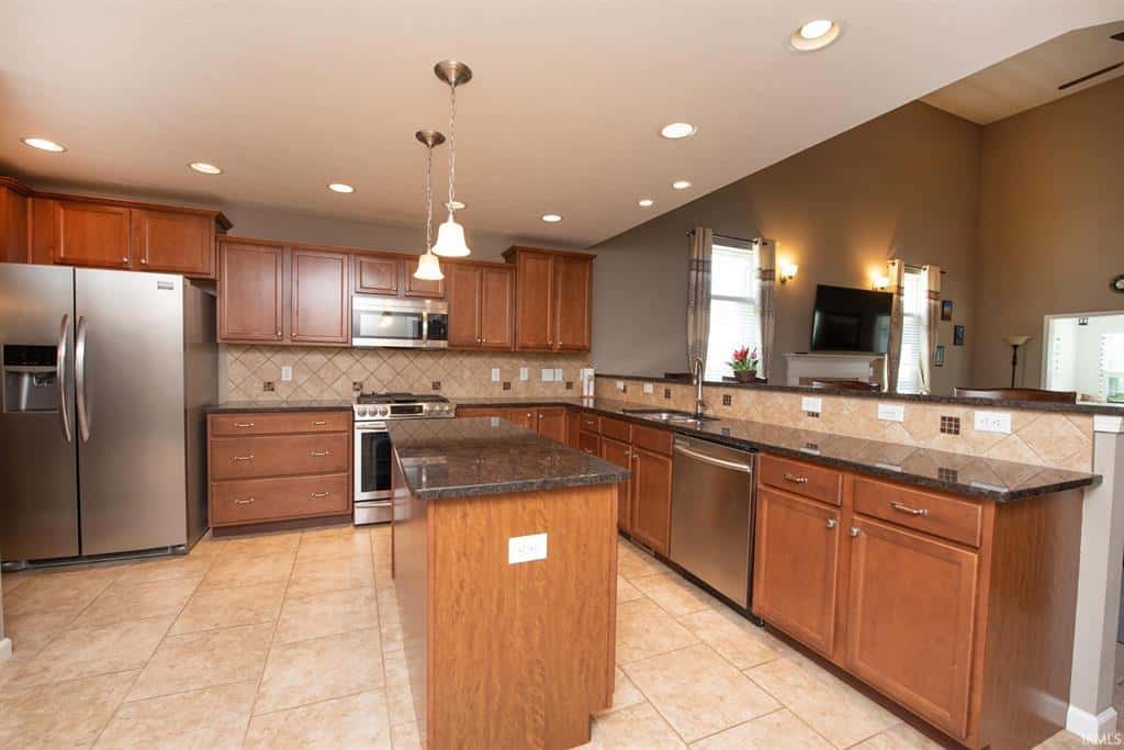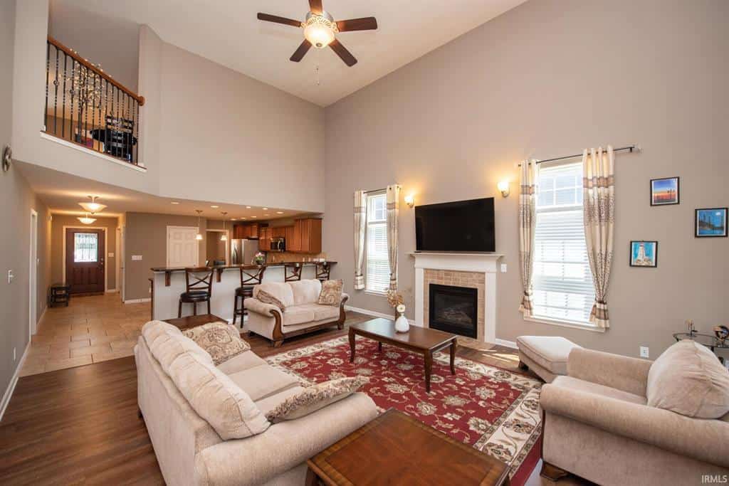 offers upgraded vinyl plank flooring, vaulted ceilings, and gas fireplace. This open floor plan has a stunning kitchen with island & large breakfast bar. Abundant