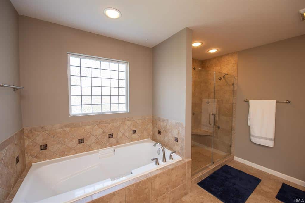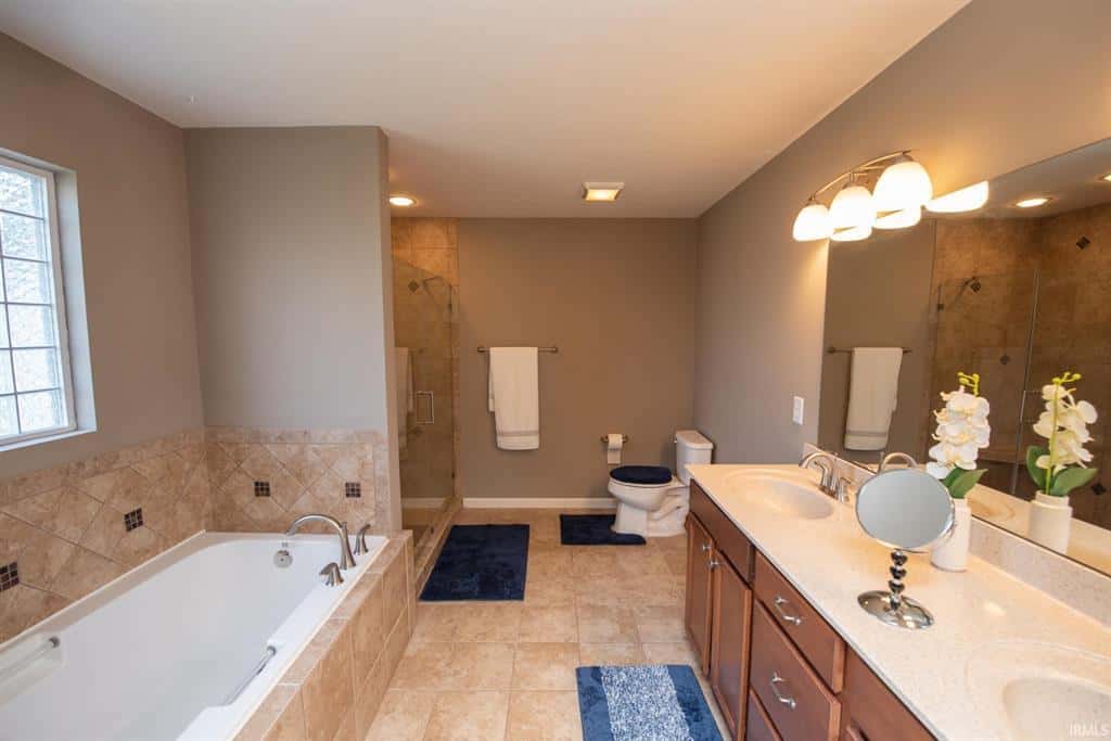 shelving in the walk-in closet, walk-in tile shower, soaking tub, and double vanity sink. 3 car attached garage has epoxy floors and additional storage space. Washer