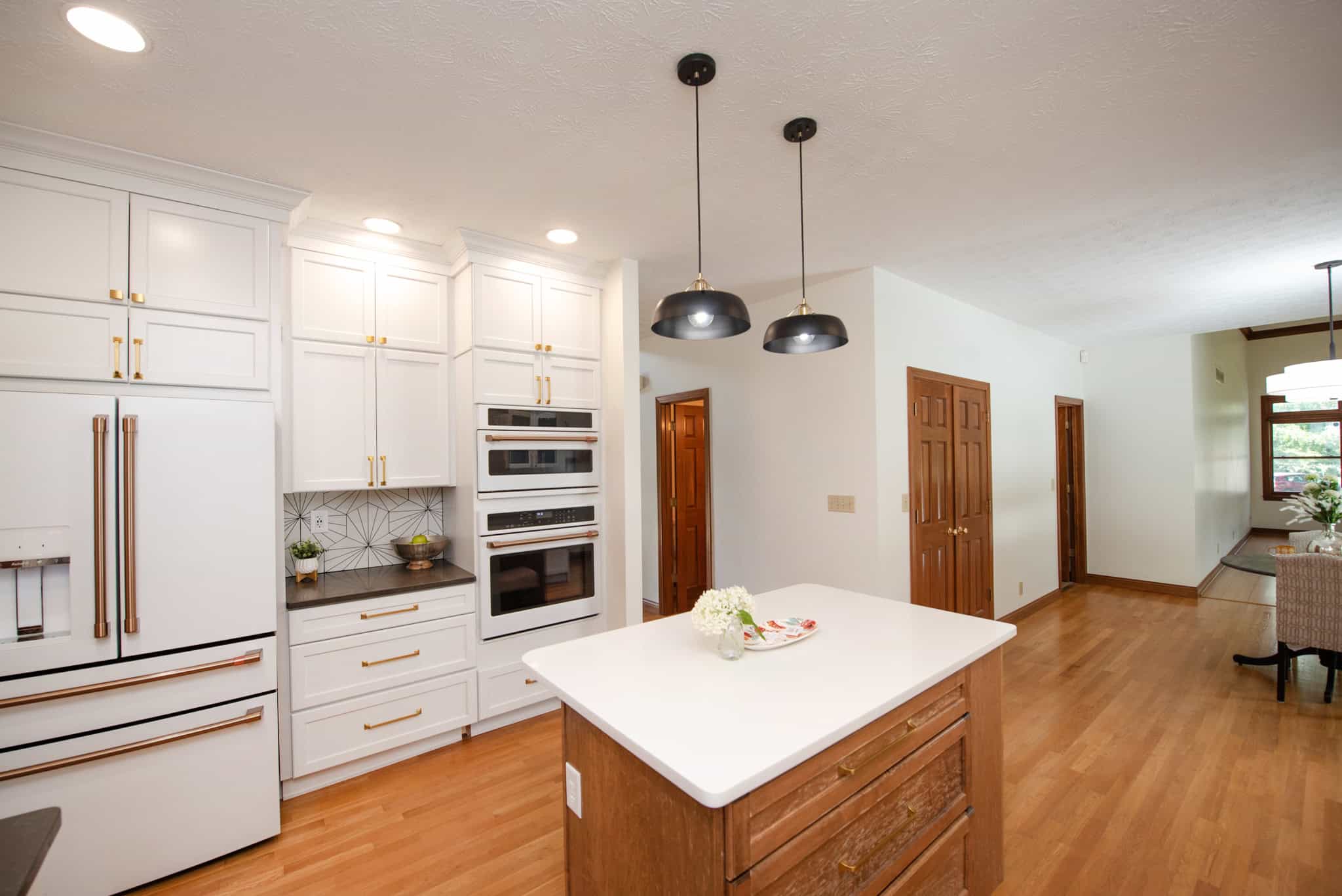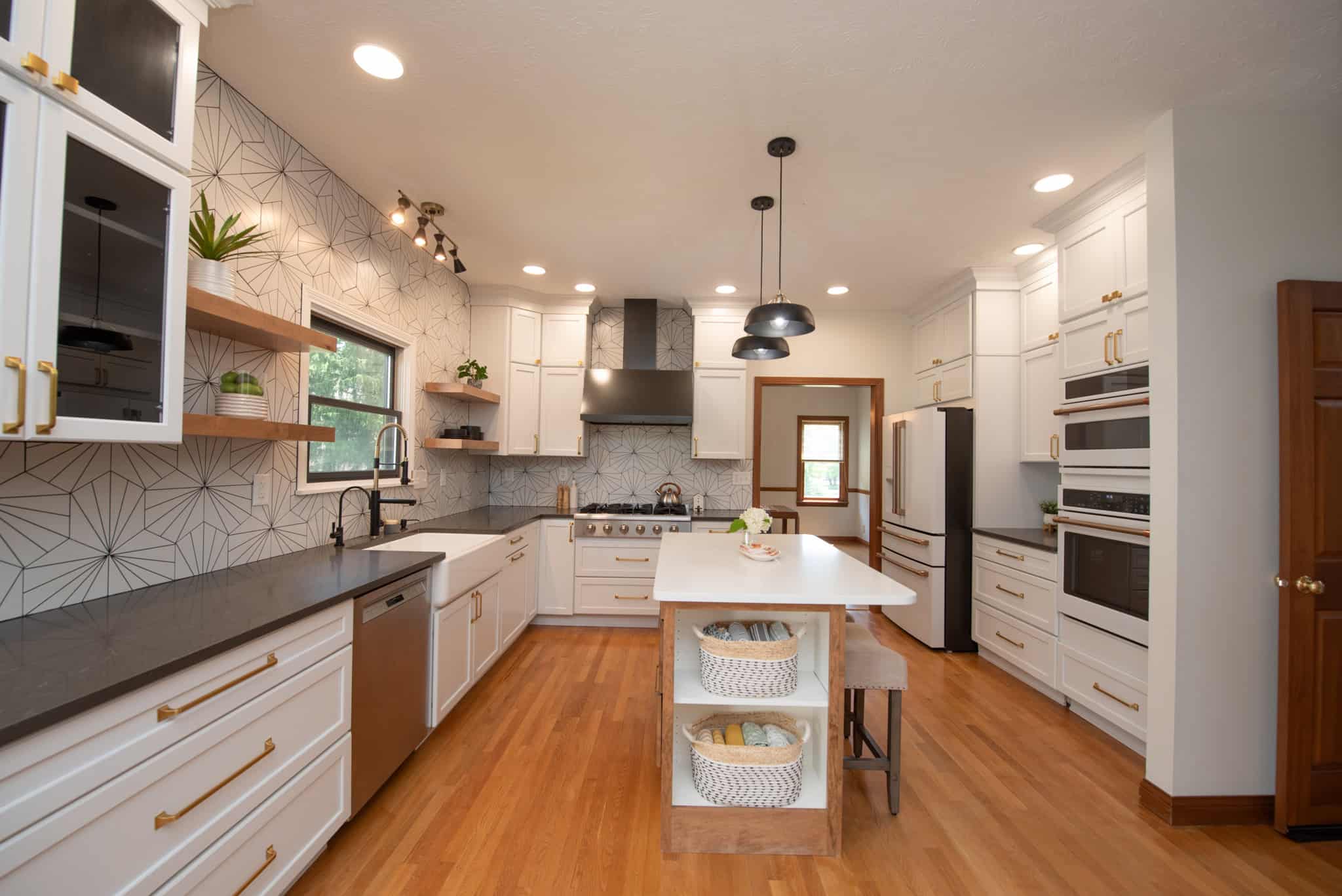 Fall in love with the stunning kitchen, featuring solid surface counters, custom hexagon ceramic tile backsplash all the way to the ceiling, farm house sink with a window overlooking the whole back yard, all new appliances in 2020-6 burner gas stove, high end refrigerator/microwave/dual ovens, Bosch dishwasher, new lighting throughout, accent shelves, gorgeous soft shut, quality cabinetry floor to ceiling, beautiful gold/bronze hardware, island with seating.